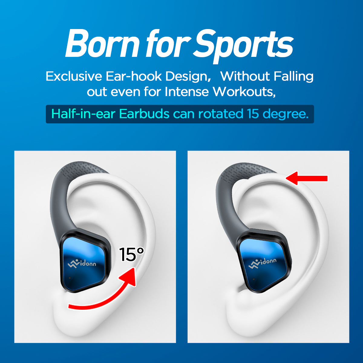 - 【More Safety Always Stay Aware】- VIDONN T1 wireless ear buds adopt Half-in-Ear design that doesn’t fully block the ear canal, letting in ambient sound so you can simultaneously listen to music and hear your surroundings, for safer training in any environment.