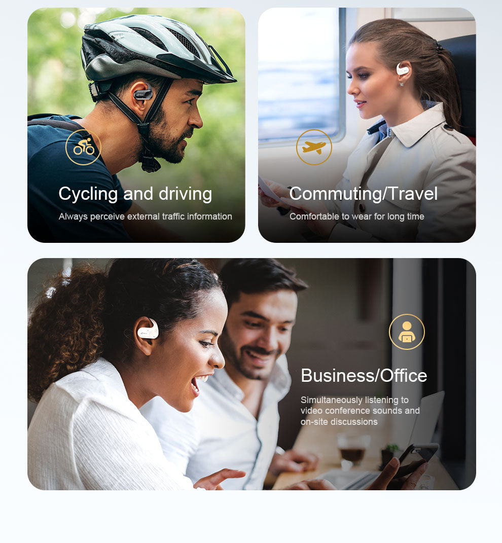 1. Adopting an open-ear design, it doesn't block the ear canal. Users can maintain awareness of the surrounding environment and avoid potential dangers caused by wearing headphones.